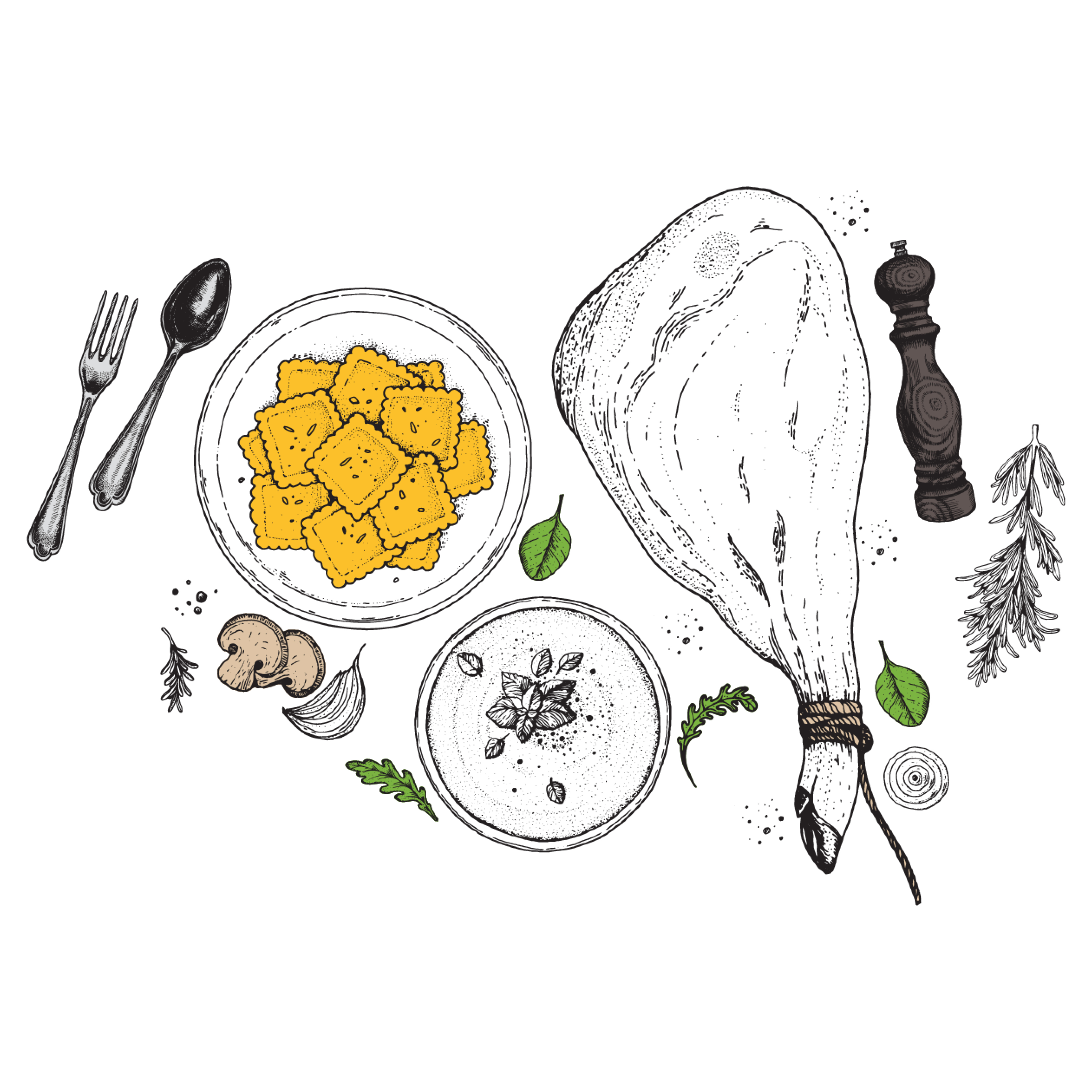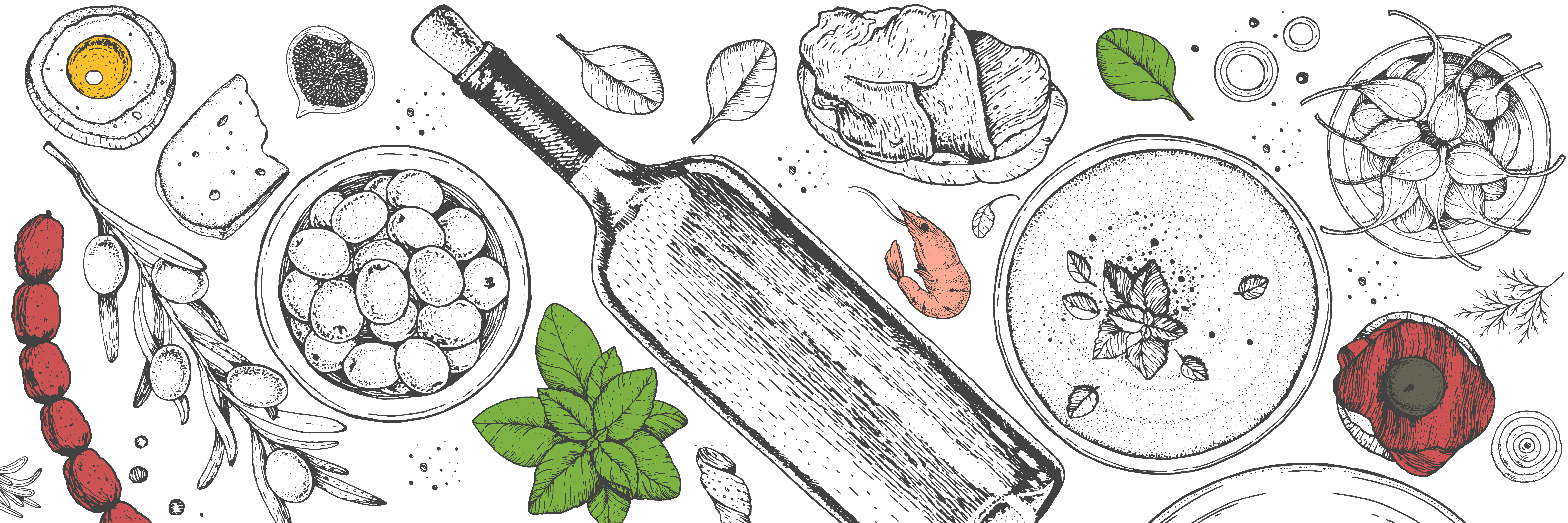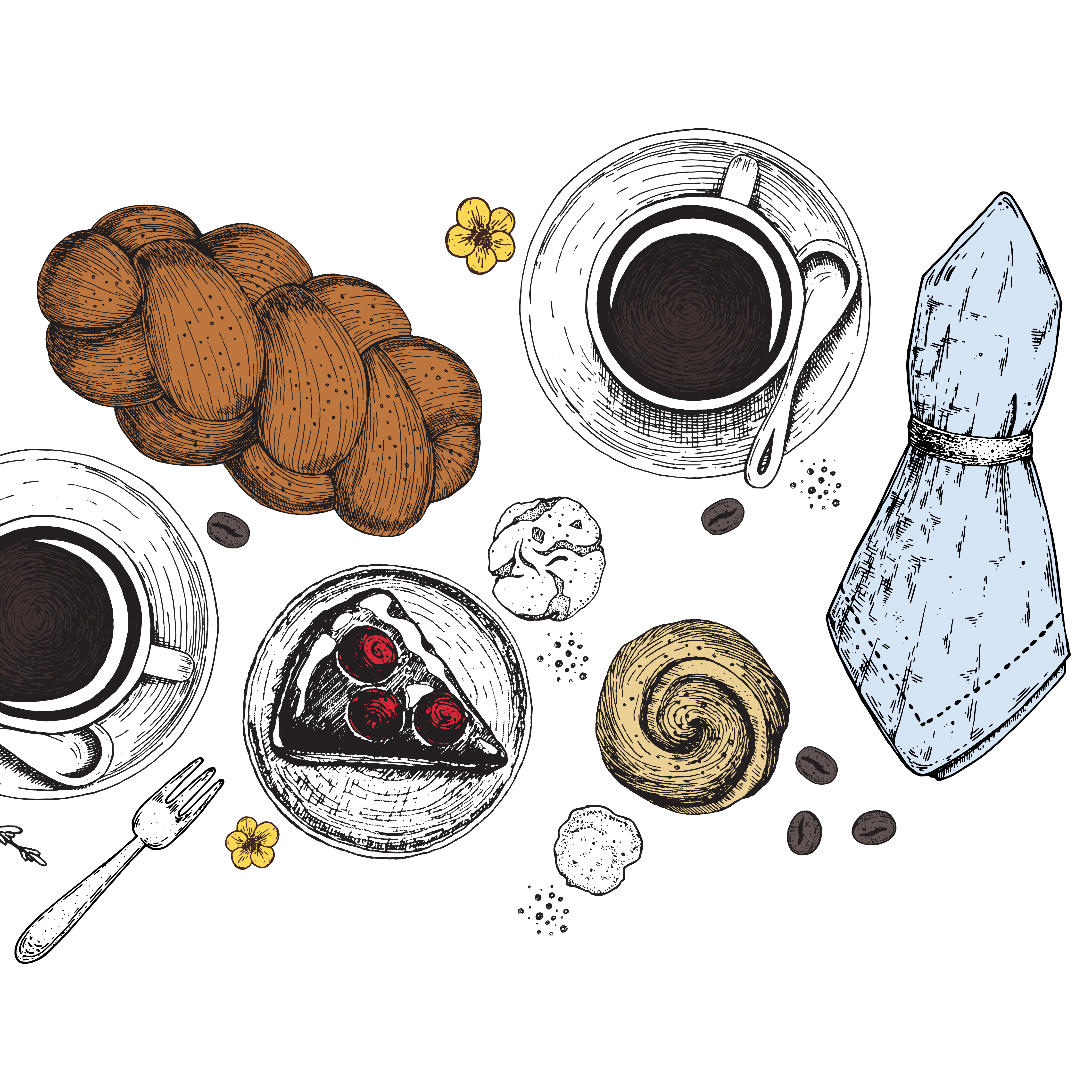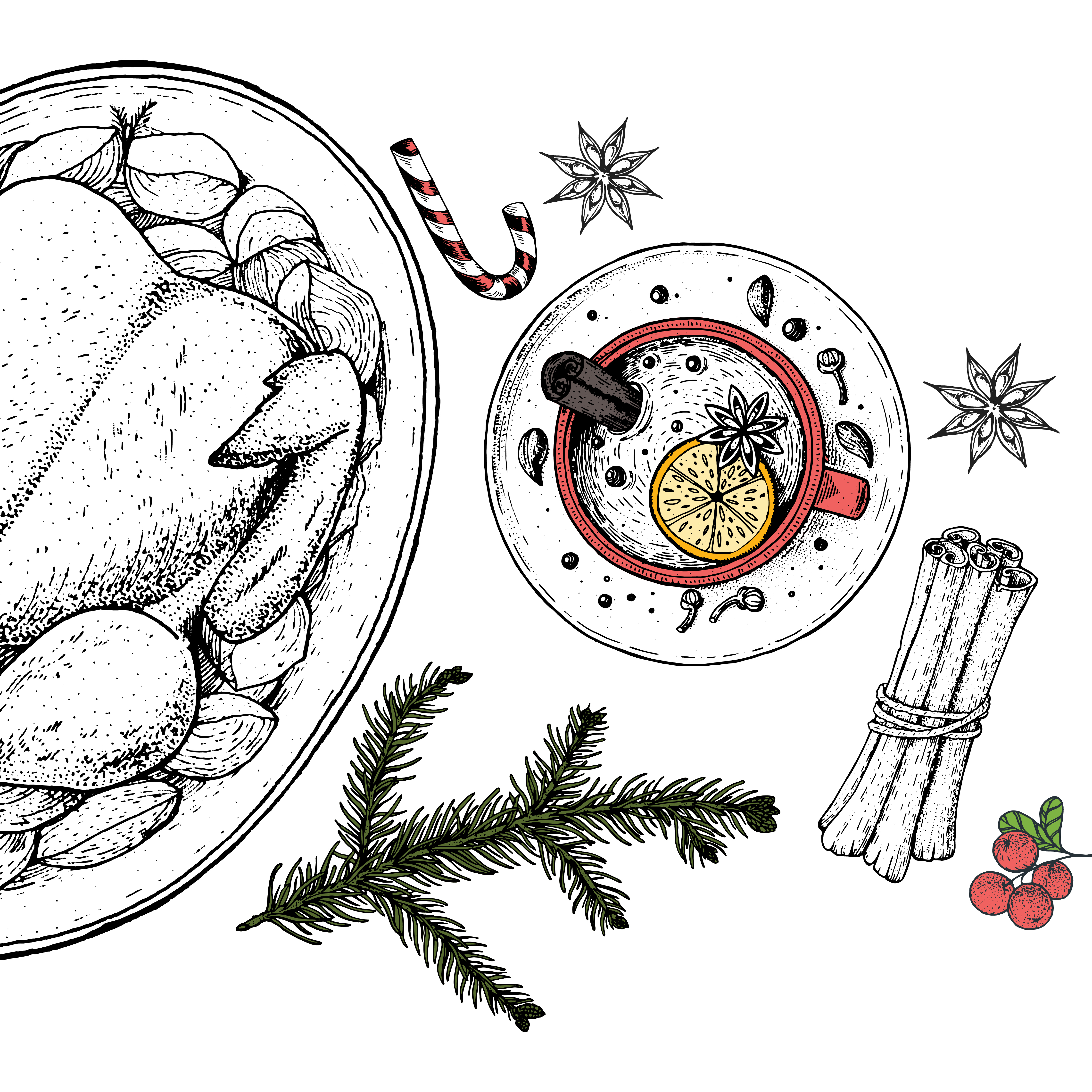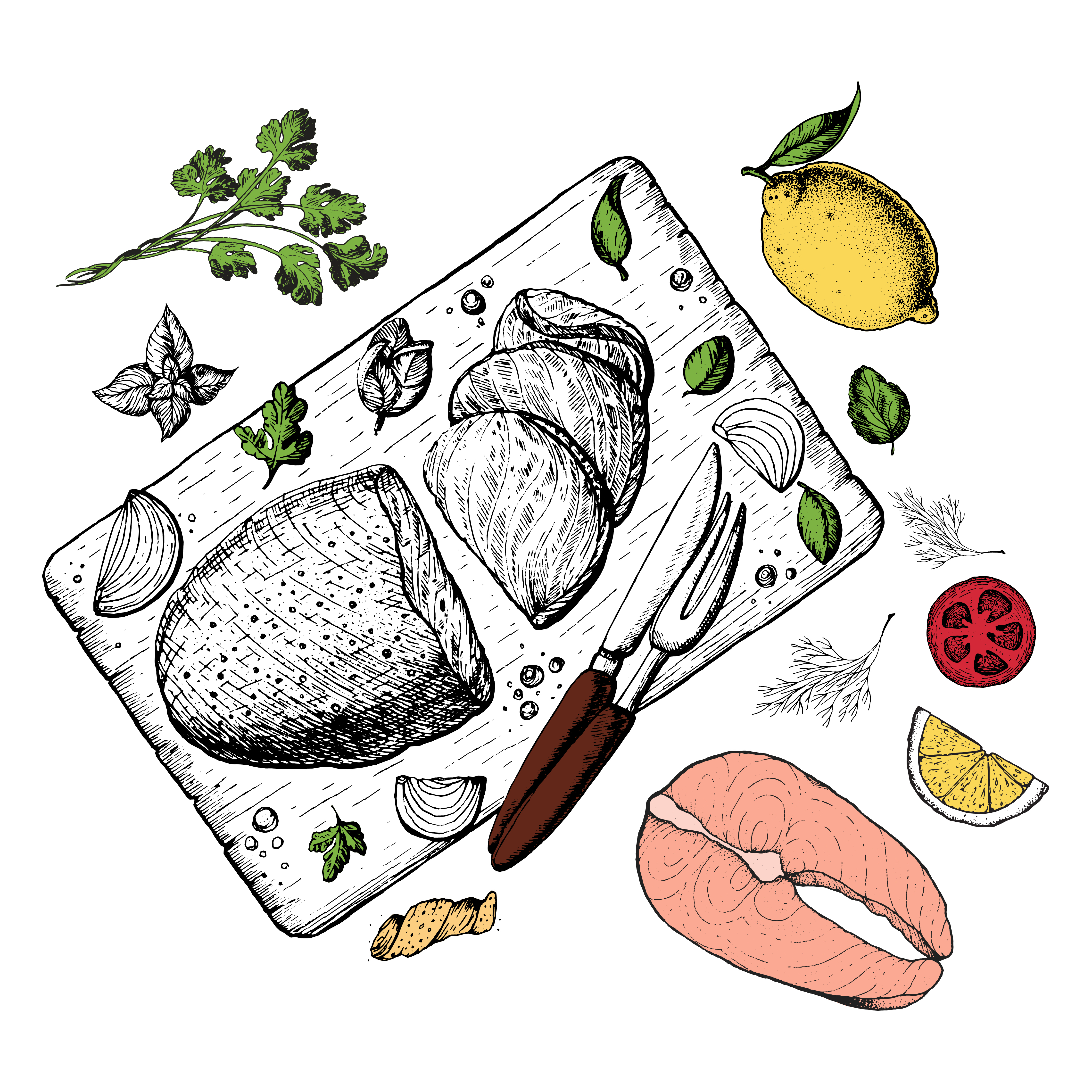 Farvelagte illustrationer. Collager særligt sammensat til KOGEHUSET.